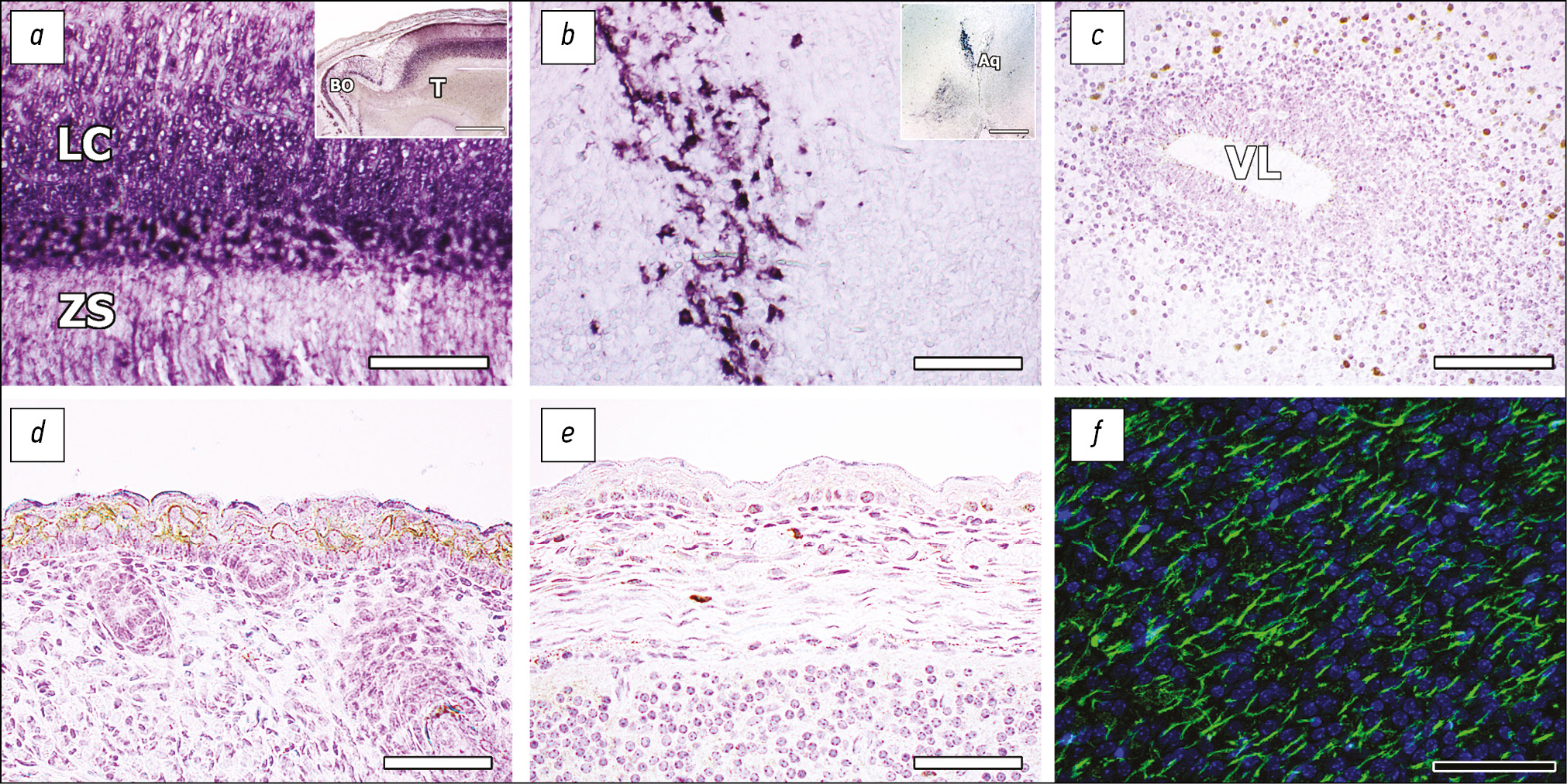 Fig. 3. Sections of murine embryo head (day 19 of intrauterine development), immunohistochemical staining after tissue transfer through polyethylene glycol: a, b, detection with alkaline phosphatase and chromogenic substrate NBT/BCIP (Nitro blue tetrazolium/ 5-bromo-4-chloro-3-indolyl phosphate) without contrasting cell nuclei; c–e, detection with peroxidase and chromogenic substrate DAB (3,3’-Diaminobenzidine), contrasting with hematoxylin; f, immunofluorescence staining with peroxidase and tyramide-rhodamine, contrasting nuclei with fluorescent dye DAPI (4’,6-diamidino-2-phenylindole). a, GRIN2A (Glutamate Ionotropic Receptor NMDA Type Subunit 2A) subunit of NMDA-receptor (N-Methyl-D-Aspartate receptor) in embryonic cortex, intense immunoreactivity in differentiating cortical lamina neurons, moderate staining of radial glial cells of the subventricular zone, the inset shows a slice view at low magnification. b, tyrosine hydroxylase, population of catecholaminergic neurons of the midbrain tegmentum in the region of the cerebral aqueduct, the inset shows a slice view at low magnification. c, NeuN/Rbfox-3, neuron-specific RNA-binding nuclear protein; staining of post-mitotic neurons that migrated radially from the proliferative subventricular zone to the olfactory bulb. d, pan-cytokeratin, differentiated keratinocytes over the basal layer of the epidermis. e, Ki67 in the skin of the dorsal surface of the embryonic head; stained mitotic cells are keratinocytes of the basal layer of the epidermis and dermal fibroblasts. f, nestin, marker of neural stem cells, expression in the cortex of the cerebral hemispheres. LC, lamina cerebralis, cortical plate; ZS, zona subventricularis, subventricular zone; T, telencephalon; BO, bulbus olfactorius, olfactory bulb; Aq, aqueduct cerebri, cerebral aqueduct; VL, ventriculus lateralis, lateral ventricle. Scale: a, c, 100 µm; b, d–f, 50 µm; on insets, 500 µm.