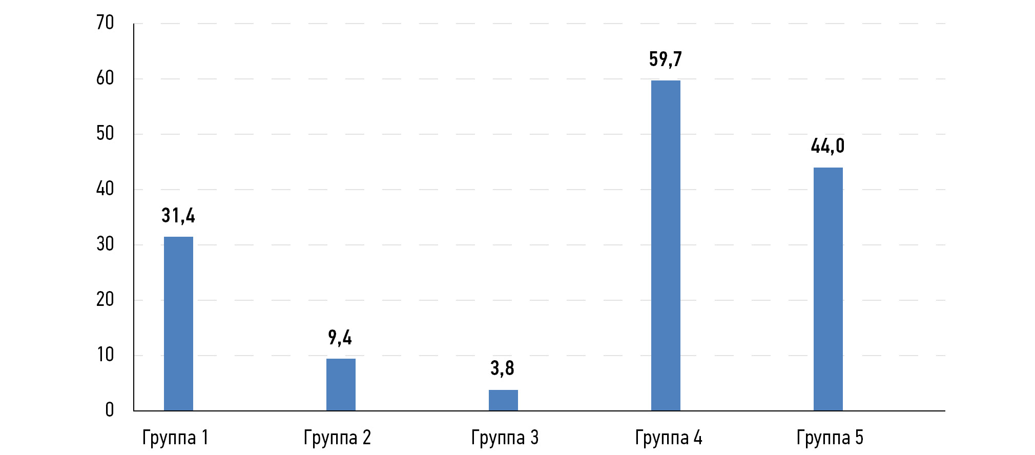 Сравнение воздействия рентгеновского излучения на популяцию тучных клеток в зависимости от суммарной поглощённой дозы без введения радиопротектора (группы 2 и 4) показало, что плотность расположения клеток в 6,3 раза выше при СПД 18 Гр (группа 4), чем при СПД 7 Гр (группа 2, p = 0,035). Сравнение воздействия излучения на популяцию тучных клеток при введении бета-D-глюкана (группы 3 и 5) выявило, что плотность расположения тучных клеток при СПД 18 Гр (группа 5) выше, чем при СПД 7 Гр (группа 3, p = 0,016). Полученные данные свидетельствует о том, что суммарная поглощённая доза 18 Гр оказывает значительное воздействие на тучные клетки и существенно изменяет их количество в сторону увеличения. Введение бета-D-глюкана перед каждым сеансом облучения способствует уменьшению количества тучных клеток, что позволяет предполагать наличие противовоспалительного действия у изучаемого препарата.