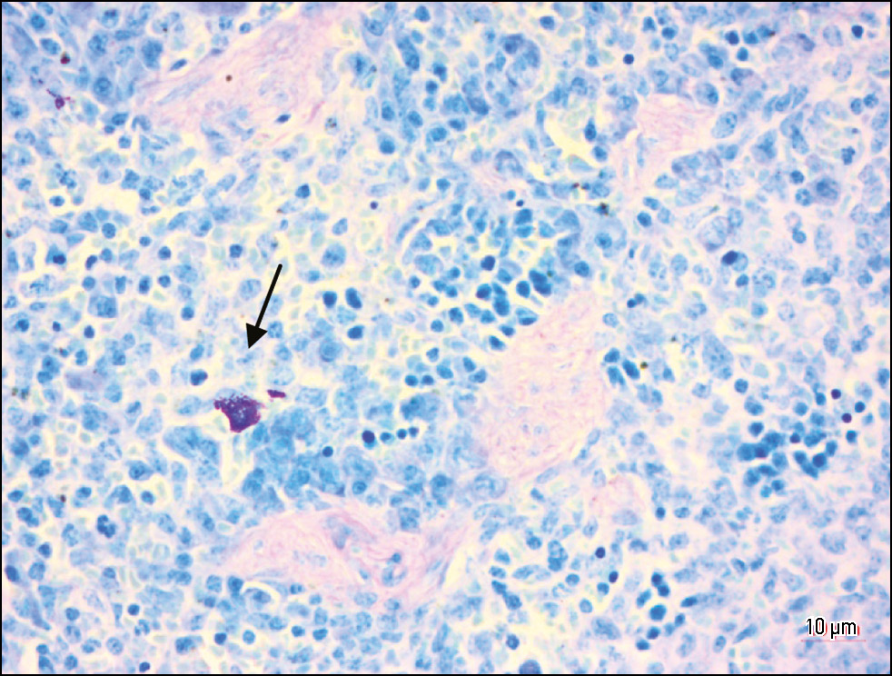 Рис. 3. Тучные клетки в селезёнке мыши после рентгеновского облучения с суммарной поглощённой дозой 18 Гр и введения бета-D-глюкана: окраска по методу Романовского–Гимзы, увеличение ×400.