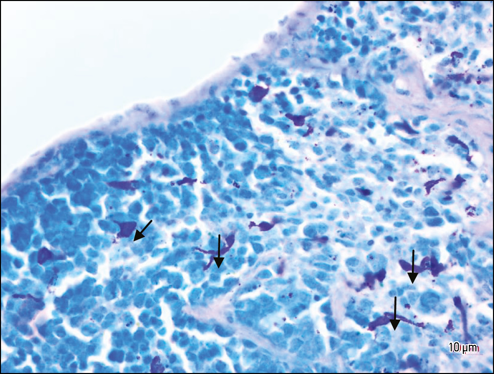 Количество тучных клеток подсчитывали в 20 непересекающихся полях зрения микроскопа при увеличении окуляра ×10, объектива ×40. Тучные клетки идентифицировали по их тинкториальным свойствам — интенсивному метахроматическому окрашиванию гранул по методу Романовского–Гимзы. Плотность расположения рассчитывали как отношение общего количества тучных клеток к 20 (число полей зрения), приведённое к единице площади равной 1 мм2. Площадь одного поля зрения составляет 0,159 мм2. Для подсчёта количества тучных клеток и получения цифровых фотографий использовали световой микроскоп Zeiss Scope A1 (Zeiss, Германия), оснащённый камерой Axiocam ERc 5s. Обработку изображений осуществляли в программе Zen 2.3 (Zeiss, Германия).