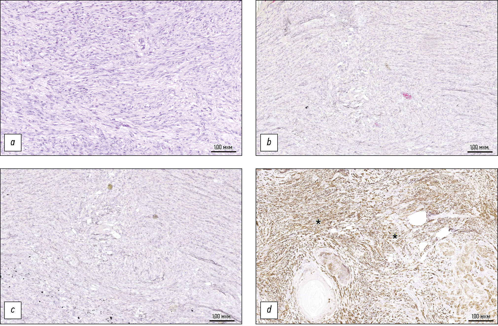 Рис. 3. Десмопластическая меланома кожи (8745/3), толщина по Breslow 4,4 мм (pT4a): a — окрашивание гематоксилином и эозином; b — окрашивание с использованием антител к Melana-A/MART-1, гранулярная цитоплазматическая экспрессия в 3% клеток; с — окрашивание с использованием антител к HMB-45, цитоплазматическая экспрессия отсутствует; d — окрашивание с использованием антител к S100, цитоплазматическая экспрессия около 85%. * обозначена экспрессия изучаемых маркеров в атипичных клетках; увеличение ×200.