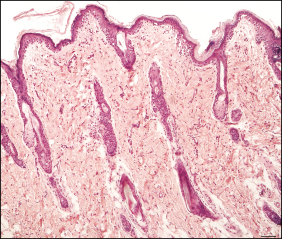 Fig. 1. Intact rat thigh skin: hematoxylin and eosin staining; objective lens ×4, eyepiece lens ×10.