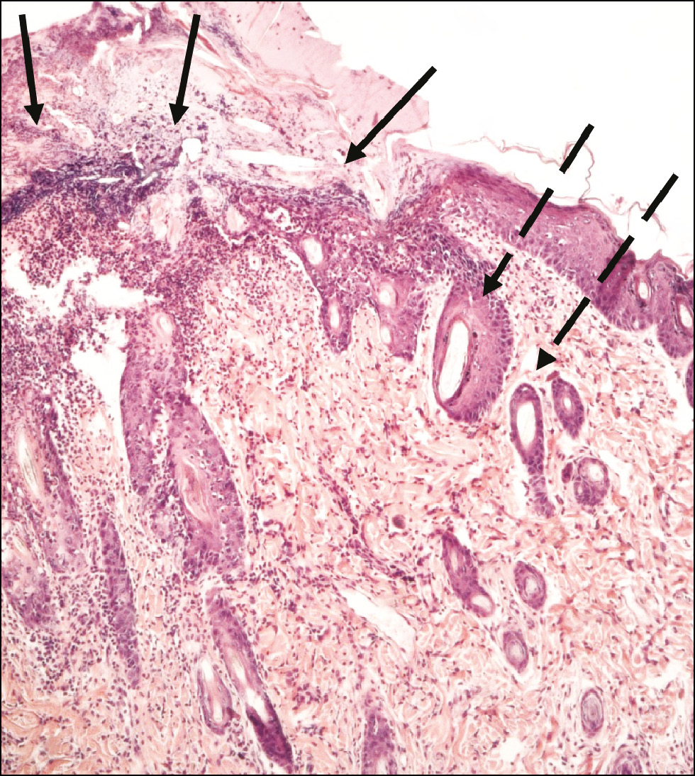 Fig. 3. Rat thigh skin 6 days after injury: black arrows, zone of primary necrosis; dashed arrows, perinecrotic zone; hematoxylin and eosin staining; objective lens ×4, eyepiece lens ×10.