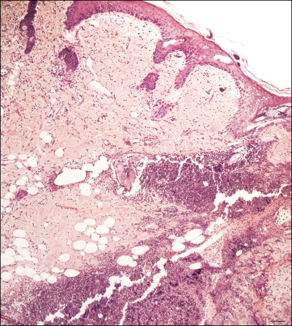 Fig. 4. Rat thigh skin 10 days after injury: perinecrotic zone; hematoxylin and eosin staining; objective lens ×4, eyepiece lens ×10.
