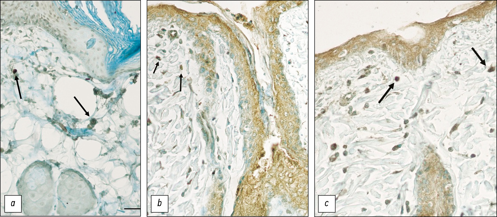 Рис. 5. Кожа бедра крысы спустя 6 суток после нанесения травмы — перинекротическая область: a — иммуногистохимическая реакция с антителами к фосфогистону Н3; b — иммуногистохимическая реакция с антителами к каспазе 3; c — иммуногистохимическая реакция с антителами к р53. Стрелками указаны иммуноположительные клетки; объектив ×40, окуляр ×10.