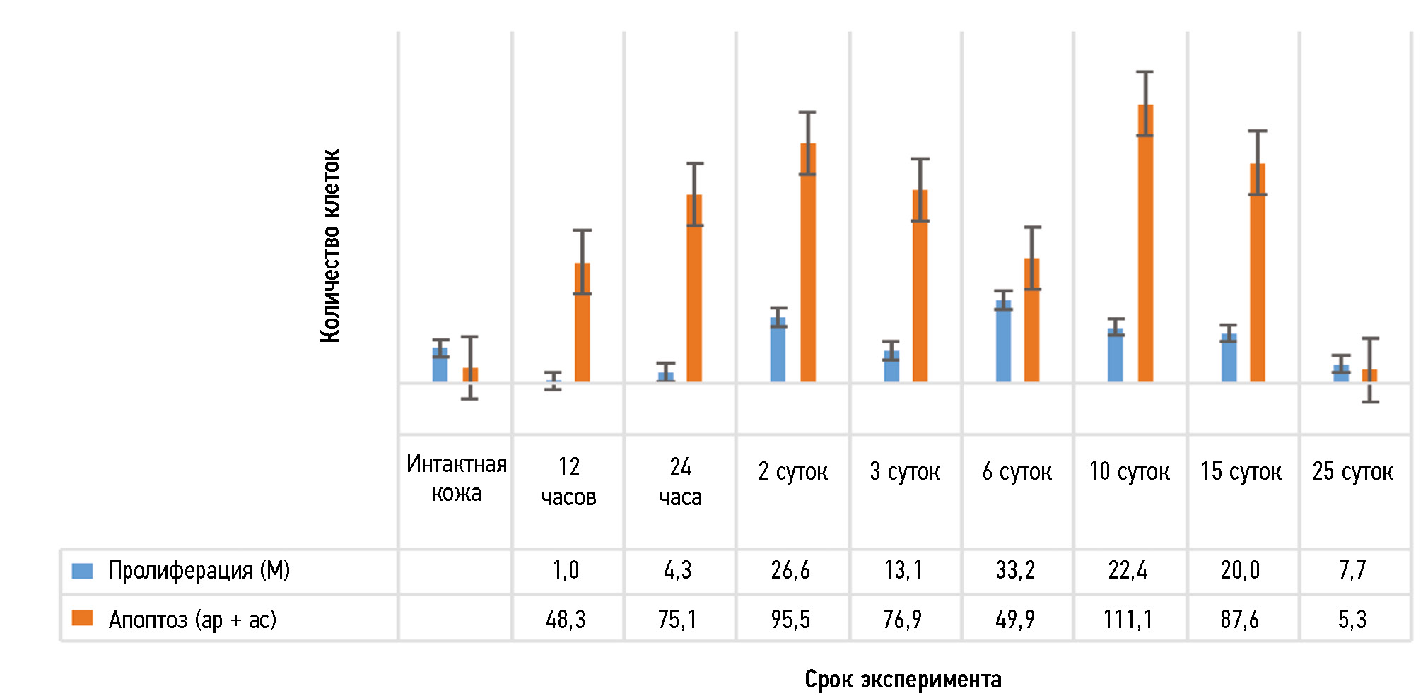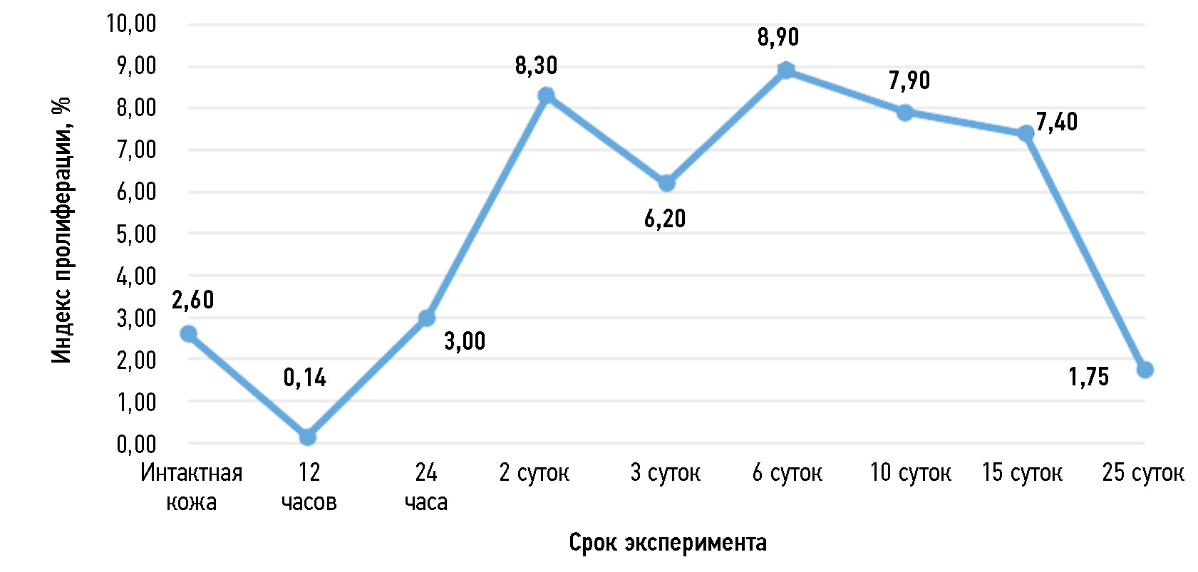 Для физиологической регенерации кожи характерно преобладание пролиферативных процессов над клеточной гибелью, что в нашем исследовании подтвердилось высоким значением пролиферативно-апоптотического индекса в коже интактных животных контрольной группы. Первые часы после механической травмы характеризуются развитием системной воспалительной реакции, которая проявляется значительным увеличением уровня клеточной гибели на фоне угнетения пролиферативных процессов. Эта реакция нашла отражение в величине пролиферативно-апоптотического индекса, который значимо ниже по сравнению с контрольной группой. Известно, что после травмы регенерационный гистогенез, следующий за воспалительной реакцией, характеризуется активной пролиферацией клеток [17]. В настоящем исследовании мы наблюдали отчётливую динамику ПАИ — до 6 суток после травмы индекс повышается. Дальнейшее заживление раны характеризуется постепенным увеличением общего количества клеток в зоне повреждения, как за счёт их миграции из прилежащих тканей, так и путём продолжающейся пролиферации резидентных клеток. На этом фоне наблюдается временное увеличение уровня маркеров клеточной гибели, что объясняется отсроченной гибелью тканевых структур и выражается в снижении ПАИ в период с 10 по 15 сутки эксперимента. При этом в указанные сроки ПАИ в 10 раз превышает значения показателя в первые сутки после травмы.