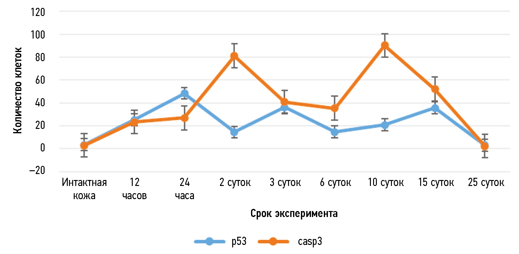 В дерме экспериментальных животных всех групп обнаружены иммунопозитивные к фосфогистону Н3, каспазе 3 и р53 клетки (рис. 5). В контрольной группе индекс пролиферации в соединительных тканях кожи составил 2,60%. Через 12 ч после травмы этот показатель ниже на 94,6% и составляет 0,14%. В ходе раневого процесса количество делящихся клеток закономерно увеличивается и достигает максимальных значений к концу первых суток и на 6-е сутки эксперимента — индекс пролиферации 8,30% и 8,90% соответственно. Через 25 суток после травматического повреждения кожи индекс пролиферации составил 1,75%, что меньше, чем в контрольной группе на 32,7% (рис. 6). В коже интактных животных встречаются единичные клетки, иммунопозитивные к маркерам апоптоза: к каспазе 3 — 2,8±2,9 клетки; к белку р53 — 3,4±2,5 клетки. После механической травмы уже через 12 часов наблюдается повышение количества таких клеток. Первой пиковых значений достигает экспрессия белка р53: через 24 часа после повреждения количество иммунопозитивных клеток составляет 48,3±4,6 (p = 0,002 при сравнении с временной точкой 12 ч). Последующие «пики» экспрессии р53 приходятся на 3 и 15-е сутки эксперимента — 36,1±0,4 и 35,6±0,1 иммунопозитивных клеток на 10 полях зрения соответственно. Наименьшее количество клеток, экспрессирующих p53, выявлено через 2 и 6 суток после травмы — 14,4±0,2 и 14,6±0,2 клеток на 10 полях зрения соответственно. На 25-е сутки визуализируются единичные p53-позитивные клетки, количество которых сопоставимо со значением в интактной коже. Повышение экспрессии каспазы 3, по сравнению с показателями интактной кожи, обнаружено через 12 и 24 ч после начала эксперимента — 23,3±1,1 и 26,8±0,1 клеток на 10 полях зрения соответственно. Однако, значимое увеличение количества каспаза 3-позитивных клеток установлено только через 2-е суток после травмы (81,1±0,3 клеток; p = 0,02 при сравнении с группой 24 ч), а абсолютный максимум пришёлся на 10-е сутки эксперимента (90,3±1,2 клеток; р = 0,05 при сравнении с группой 6 суток). Необходимо отметить, что общее количество клеток, экспрессирующих каспазу 3, превышает количество р53-иммунопозитивных клеток во всех временных точках (рис. 7). Исследование перинекротической области кожной раны показало, что процессы клеточной гибели на начальных этапах посттравматического гистогенеза преобладают над пролиферативными и отличаются от контроля (см. рис. 7). В то же время количество клеток, находящихся в начальной фазе митоза, свидетельствует о резком снижении интенсивности пролиферации в первые часы после ранения и её статистически значимом повышении (p = 0,003) уже к концу первых суток эксперимента (см. рис. 6).