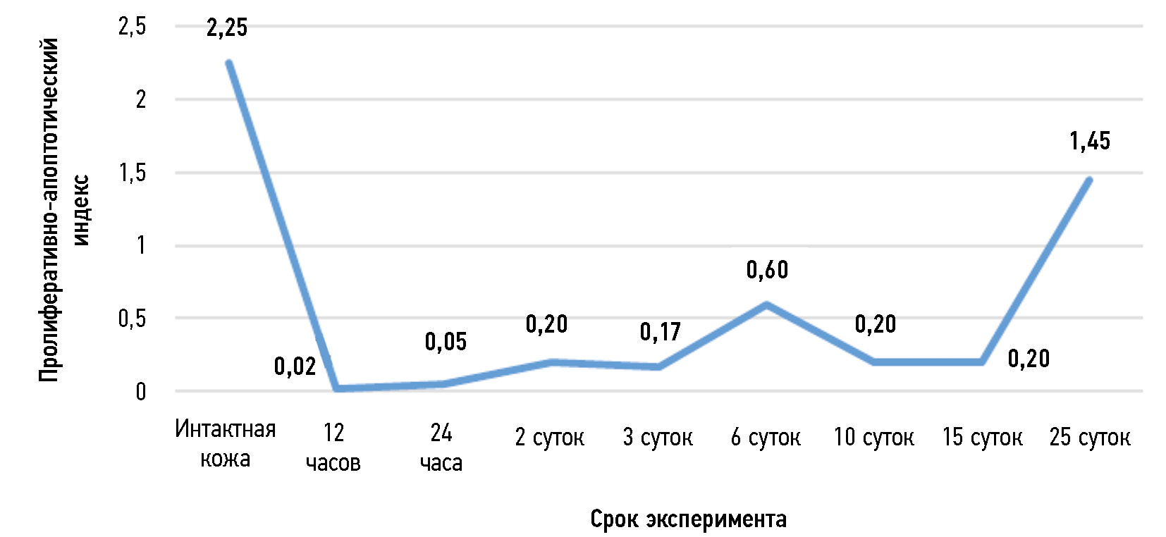 Несмотря на то, что у части животных регенерация тканей визуально полностью завершается к 25-м суткам эксперимента, необходимо учитывать индивидуальные особенности течения процессов заживления. К концу эксперимента индекс пролиферации ниже, чем в нулевую фазу регенерации (в коже интактных крыс), однако показатели апоптоза сопоставимы с таковыми в контрольной группе. Предложенный нами индекс отражает подобные изменения соотношения пролиферации и апоптоза и на 25-е сутки эксперимента существенно превышает значения в предыдущих временных точках, однако остаётся на 35,6% ниже контрольного показателя.