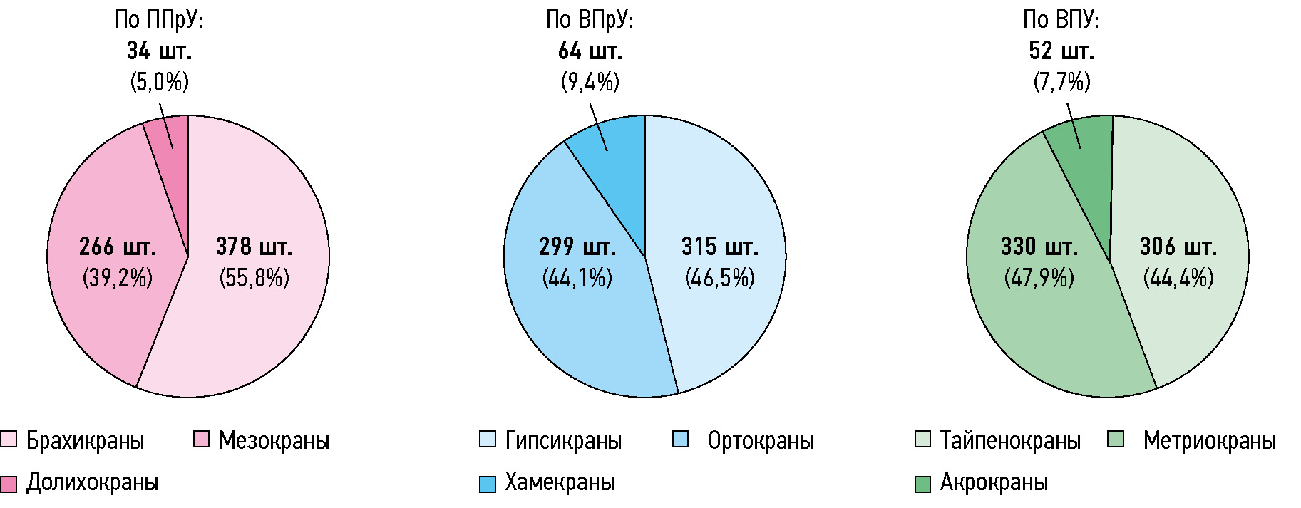 В результате комплексного краниологического анализа было отобрано 678 целых черепов без признаков механических повреждений, не имеющих деформаций, асимметрии и аномалий развития. Среди этих черепов 531 принадлежал мужчинам, 147 — женщинам. Графическое изображение распределения черепов без деформаций на типы представлено на диаграммах (рис. 1).