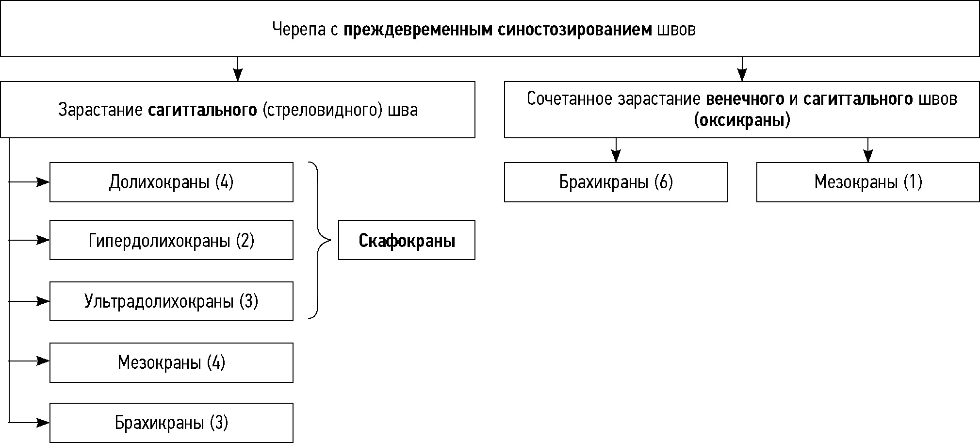 Рис. 2. Схема распределения по типам черепов с преждевременным синостозированием: в скобках указано количество черепов в каждой подгруппе.