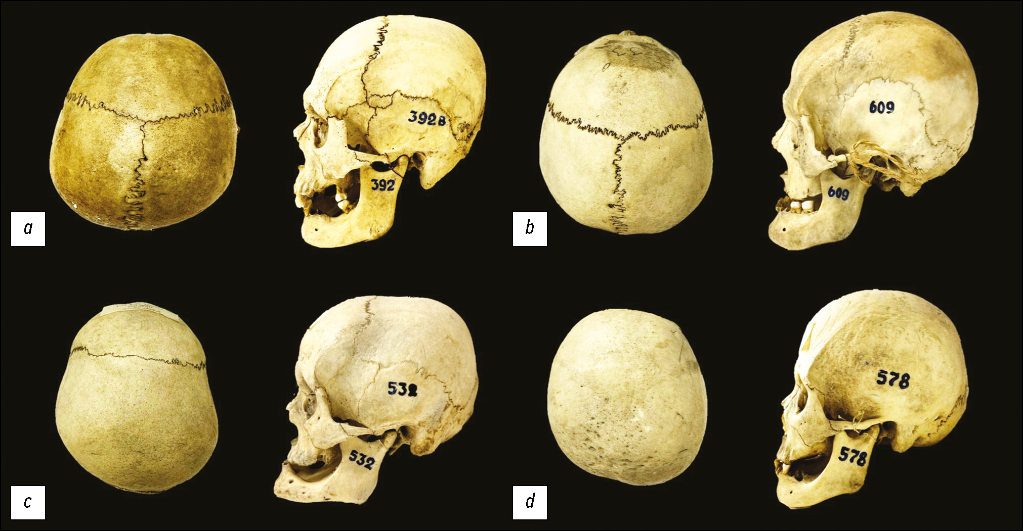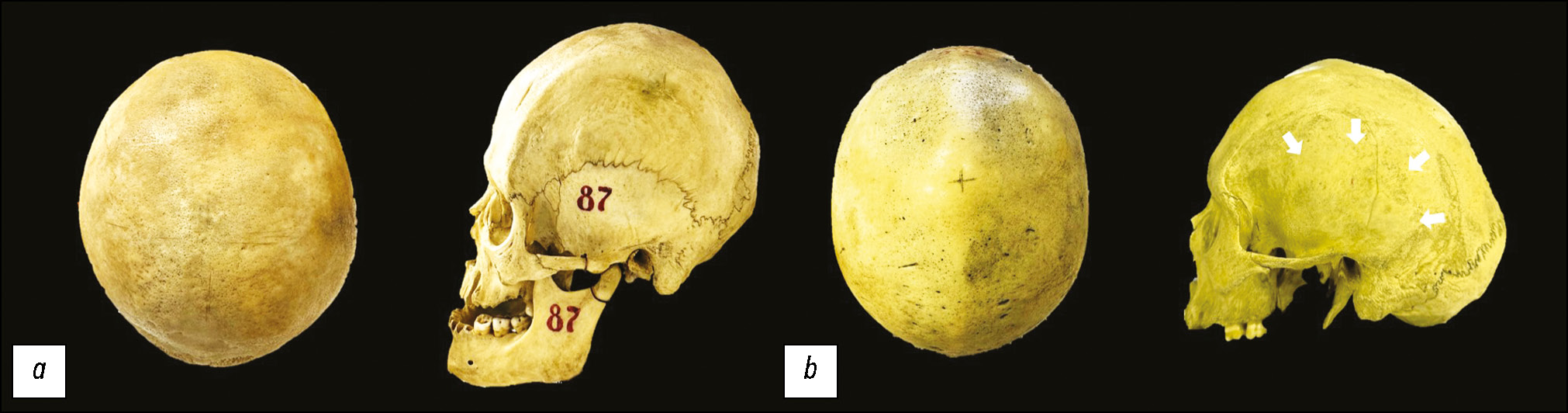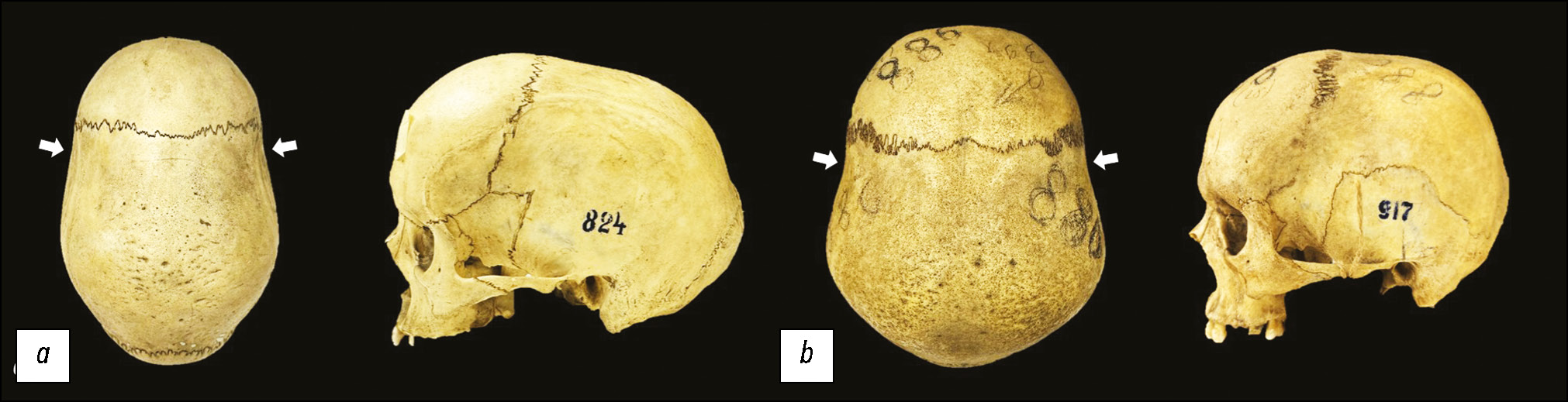 Следует отметить, что среди черепов со стреловидным синостозом было обнаружено 4 мезокрана (ППрУ 75,7–78,5; рис. 3, b). Средние значения диаметров мозгового черепа в этой группе составляют: продольный — (179,7 ± 3,9) мм, поперечный — (138,2 ± 2,4) мм, высотный — (132,0 ± 2,5) мм. Также было найдено 3 брахикрана (ППрУ 80,1–81,8) с преждевременным синостозированием сагиттального шва. Средние значения их диаметров мозгового черепа следующие: продольный — (180,0 ± 2,7) мм, поперечный — (145,6 ± 1,6) мм, высотный — (136,0 ± 4,0) мм. Следовательно, преждевременное зарастание сагиттального шва не всегда приводит к деформации головы, описанной как скафоцефалия. Лишь 9 черепов, определённых по ППрУ как долихокраны, приобрели аномально длинную, узкую и низкую форму. На черепах мезокранов были отмечены развитые височные линии и теменные бугры, а также явное сужение позади венечного шва (см. рис. 3, b), что также позволяет классифицировать их как клинокраны — черепа с седлообразной деформацией свода. На черепах брахикранов усиления наружного рельефа костей, сужения позади венечного шва отмечено не было, что не позволяет отнести их ни к скафокранам, ни к клинокранам.
