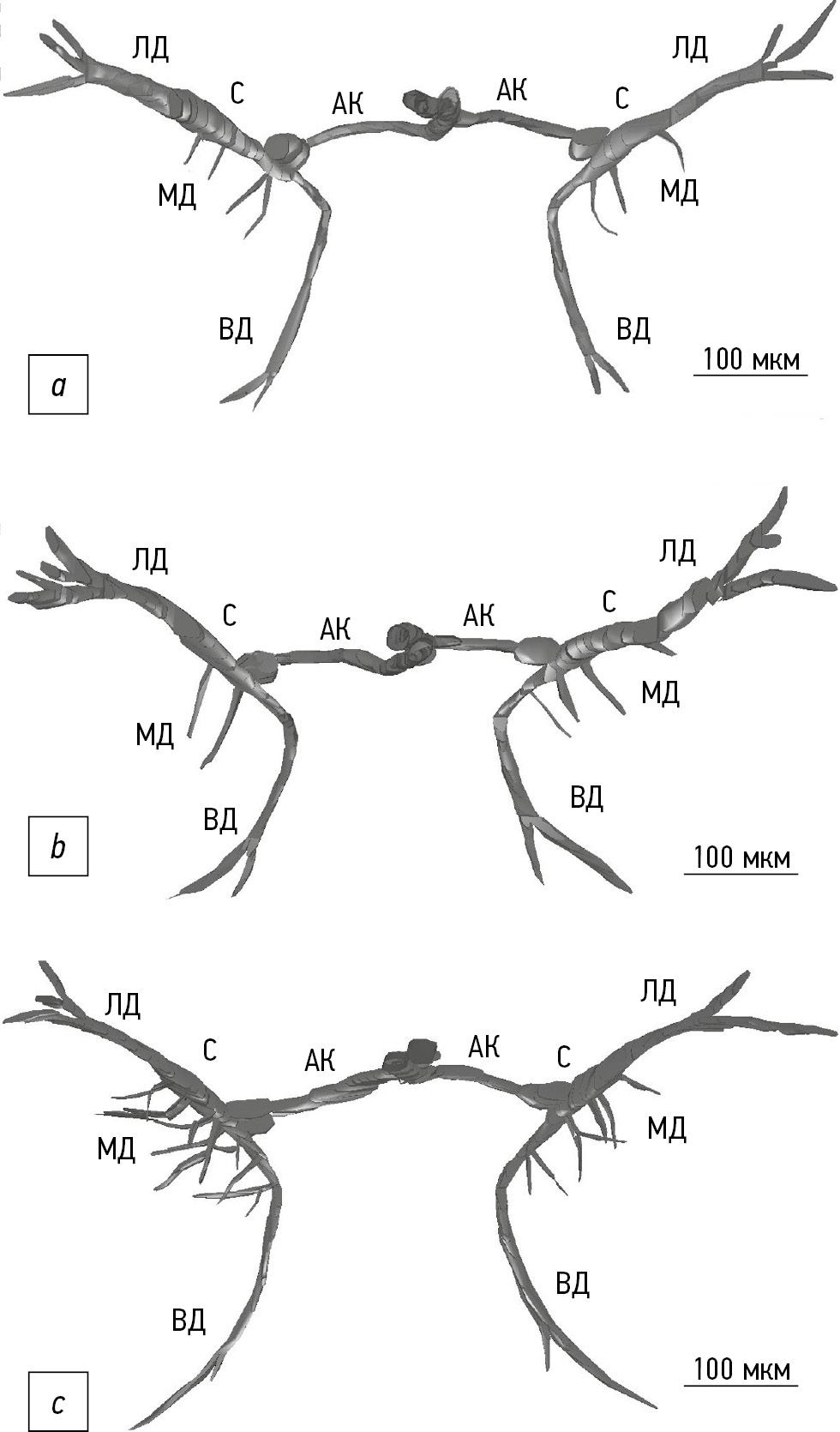 Рис. 1. Виртуальные изображения интегрального строения маутнеровских нейронов золотой рыбки (Carassius auratus (L)): а — в интактной группе; b — в группе 1 (аппликация бета-амилоида и раствор L-дофа); c — в группе 2 (раствор L-дофа и аппликация бета-амилоида). Глутар-осмиевая фиксация, заключение в эпон. Обозначения: С — сома клетки; ЛД — латеральный дендрит; ВД — вентральный дендрит; МД — медиальный дендрит; АК — аксон.