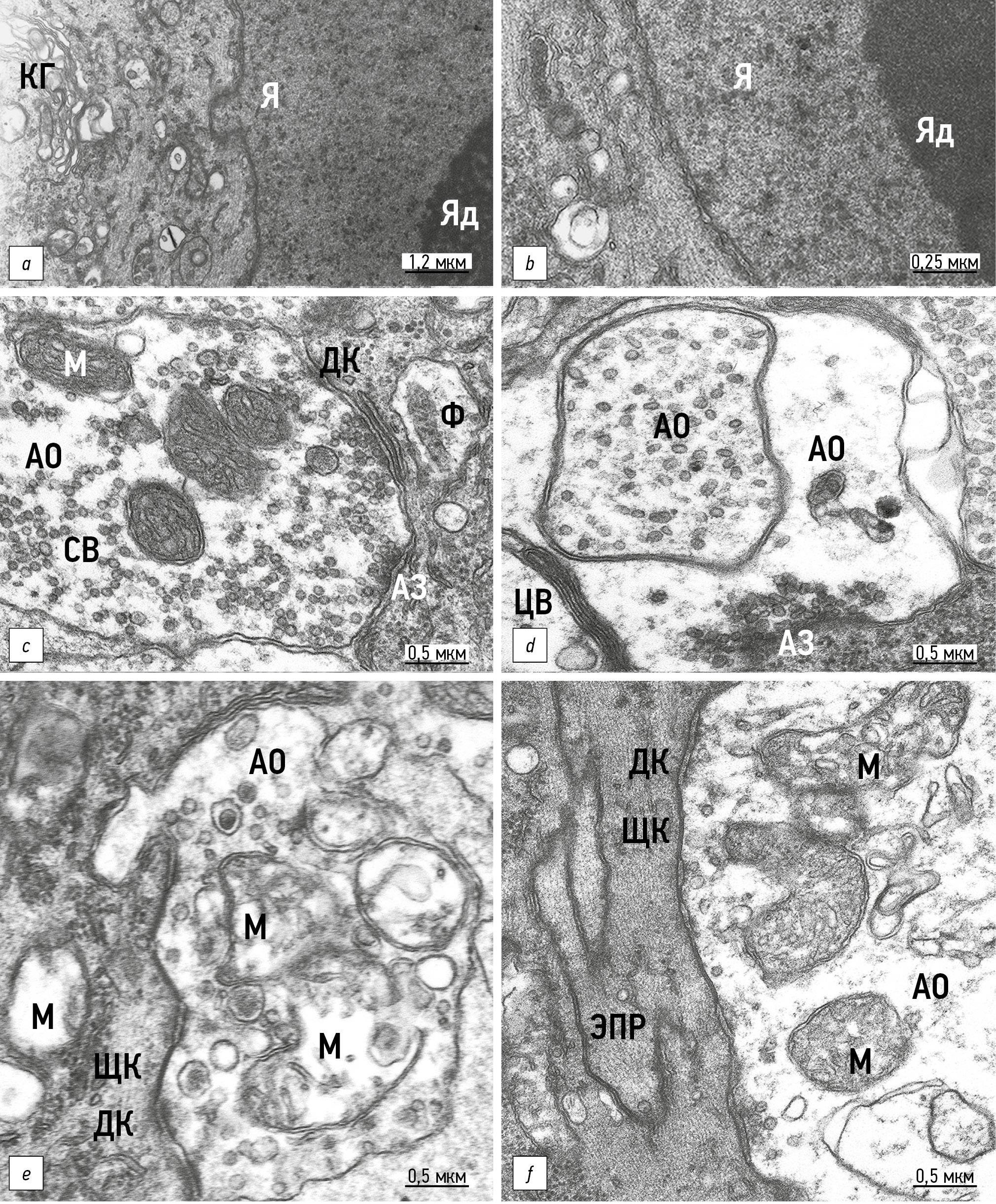 Рис. 2. Ультраструктура маутнеровских нейронов золотой рыбки (Carassius auratus (L)) и их афферентных синапсов: а, с, е — в группе 1 (аппликация бета-амилоида и раствор L-дофа); b, d, f — в группе 2 (раствор L-дофа и аппликация бета-амилоида). Глутар-осмиевая фиксация, заключение в эпон. Обозначения: КГ — комплекс Гольджи; Я — ядро; Яд — ядрышко; СВ — синаптические везикулы; АО — аксонное окончание; М — митохондрия; ДК — десмосомоподобный контакт; Ф — фагосома; АЗ — активная зона; ЦВ — цитоплазматический вырост; ЩК — щелевой контакт; ЭПР — эндоплазматический ретикулум.