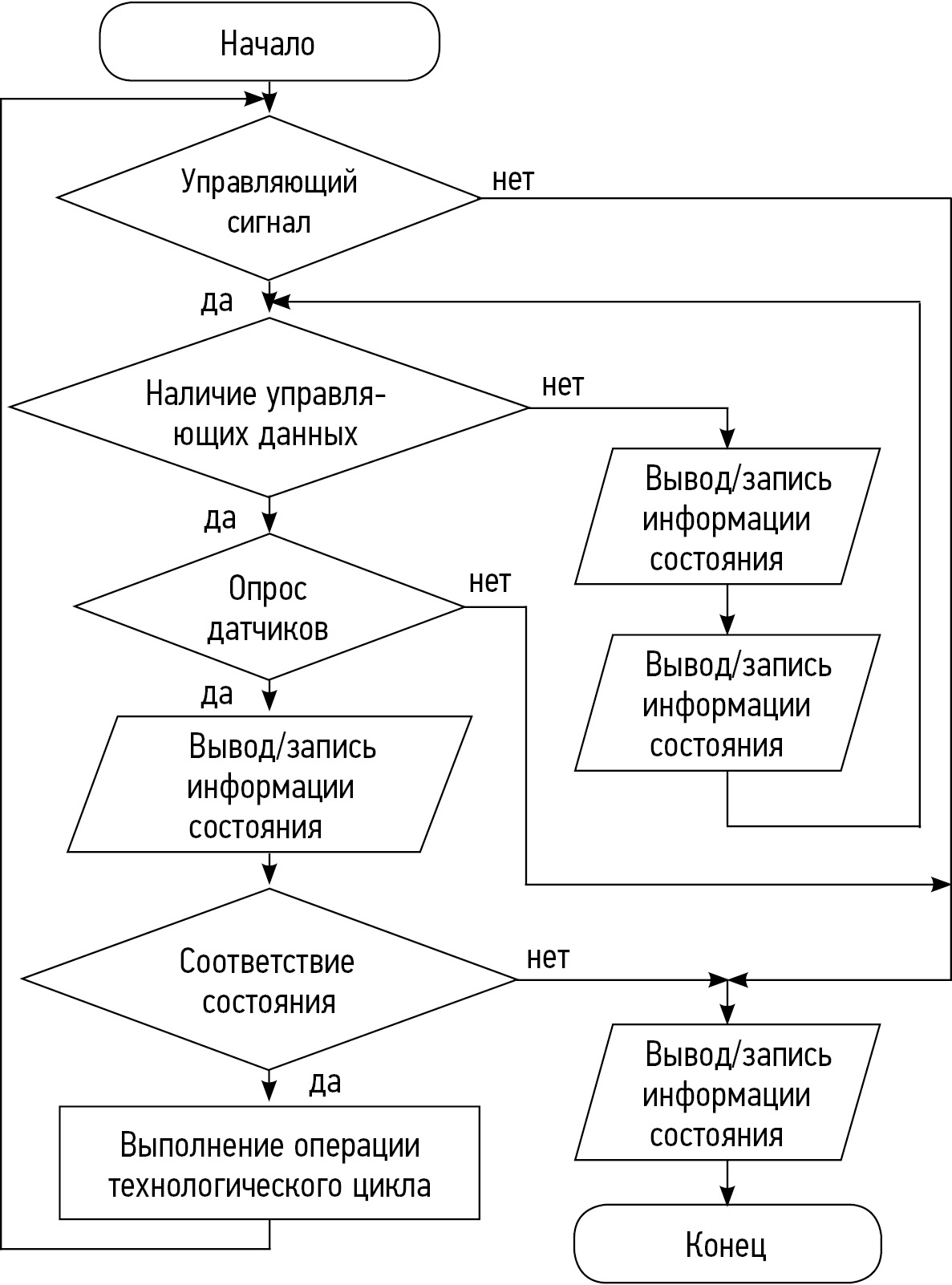 Концепция системы подачи порошкового материала, отвечающая требованиям четвертой технологической революции, должна обладать набором датчиков, осуществляющих контроль настоящего состояния. Основными параметрами контроля являются: давление в транспортировочной магистрали; наличие порошка в магистрали; расход порошкового материала; наполненность бункера; наличие алгоритмов управления, учитывающих инерционность подачи порошкового материала от дозирующего узла до зоны наплавки. На рис. 3 представлен алгоритм работы устройства подачи порошкового материала в зону обработки. Блок «управляющий сигнал» предполагает получение цифрового/аналогового сигнала о начале или завершении операции технологического цикла. Ввод параметров работы устройства возможно осуществлять по протоколу Modbus ASCII/Modbus TCP, записи соответствующих параметров в память устройства. Помимо управляющих параметров, возможен ввод контролируемых параметров, таких как заполнение бункера, давление транспортировочного газа в магистрали, расход порошкового материала, существует возможность задавать состояния системы для получения предупреждений. Состояния устройства в процессе работы (блок алгоритма «вывод/запись информации состояния») сохраняются в памяти в виде семплов, ограниченных по объему данных, имеющих привязку ко времени. Доступ возможен путем физического извлечения модуля памяти или обращения по протоколу Modbus. Приоритет выполнения операции установлен по внешнему сигналу. Помимо выполнения операции, возможен запрос изменения состояния данных (уровня контролируемых параметров датчиков).