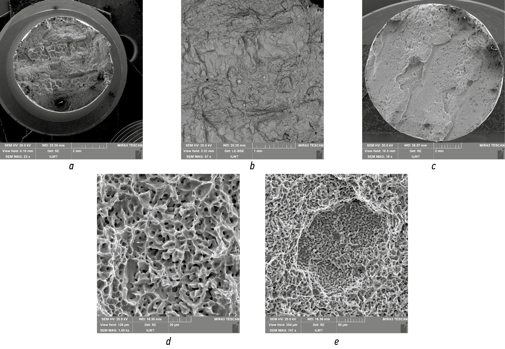 Fig. 8. Fractures view: a, general view, axis Х; b, magnification, axis Х; c, general view, axis Z; d, ductile fracture area, axis Z; e, brittle fracture area, axis Z.