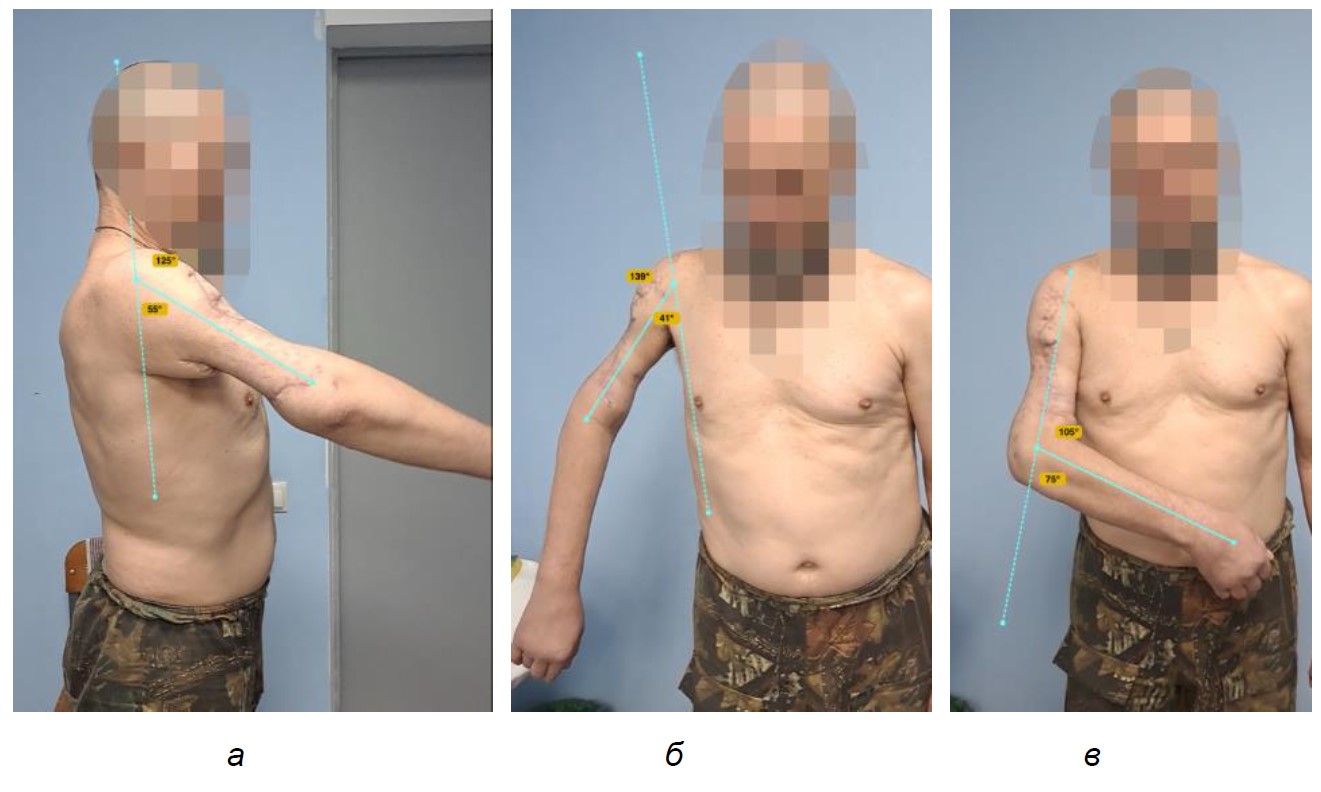 Исследование включало клинический осмотр пациента, анализ медицинской документации, рентгенограмм, гониометрию суставов верхней конечности: измерение углов активного и пассивного сгибания и отведения плеча до и после курса реабилитации в экзоскелете «Экзар34».