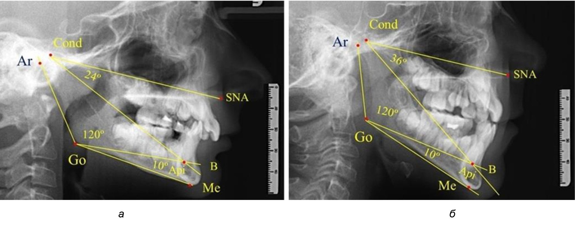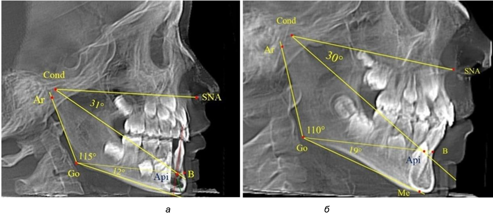 При анализе ТРГ 5 детей в периоде прикуса молочных зубов отмечено, что величина основного угла гнатической части лица SNA-Cond-Api, как правило, в норме составляла около 30°, и его величина была относительно стабильной у всех обследованных детей. В то же время угол нижней челюсти и его составляющие отличались вариабельностью параметров при различных показателях нижнечелюстного угла (рис. 4).