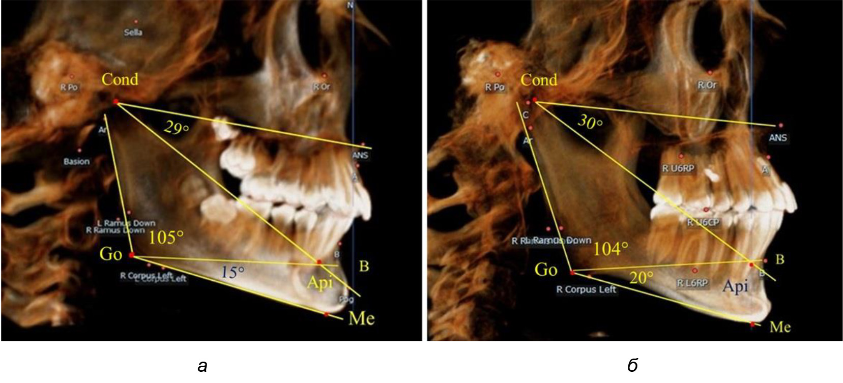 На представленных клинических примерах, несмотря на различия параметров основного угла гнатической части лица, определялись однотипные варианты угла нижней челюсти Ar-Go-Me и его составных частей Ar-Go-Api и Api-Go-Me.