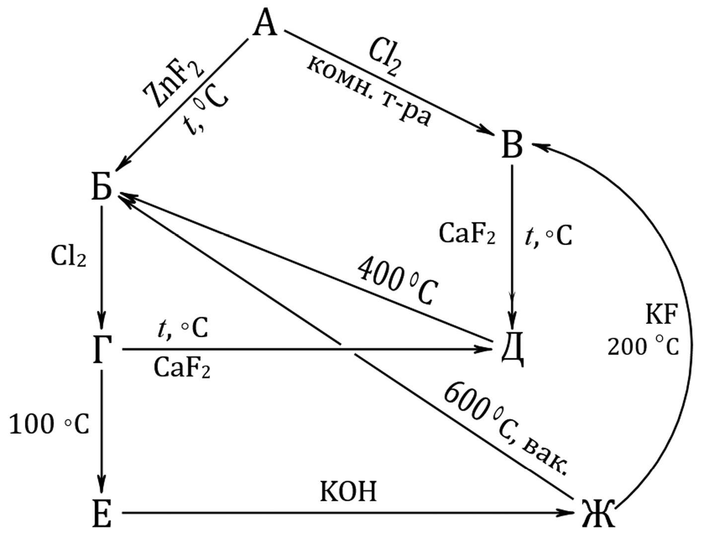 Расшифруйте схему превращений (рис. 1). Все вещества, обозначенные русскими буквами, содержат элемент Х. Известно, что вещество Б с хлором реагирует в мольном соотношении 1 : 1, а прямая обработка вещества Г концентрированным KOH не приводит к Ж.