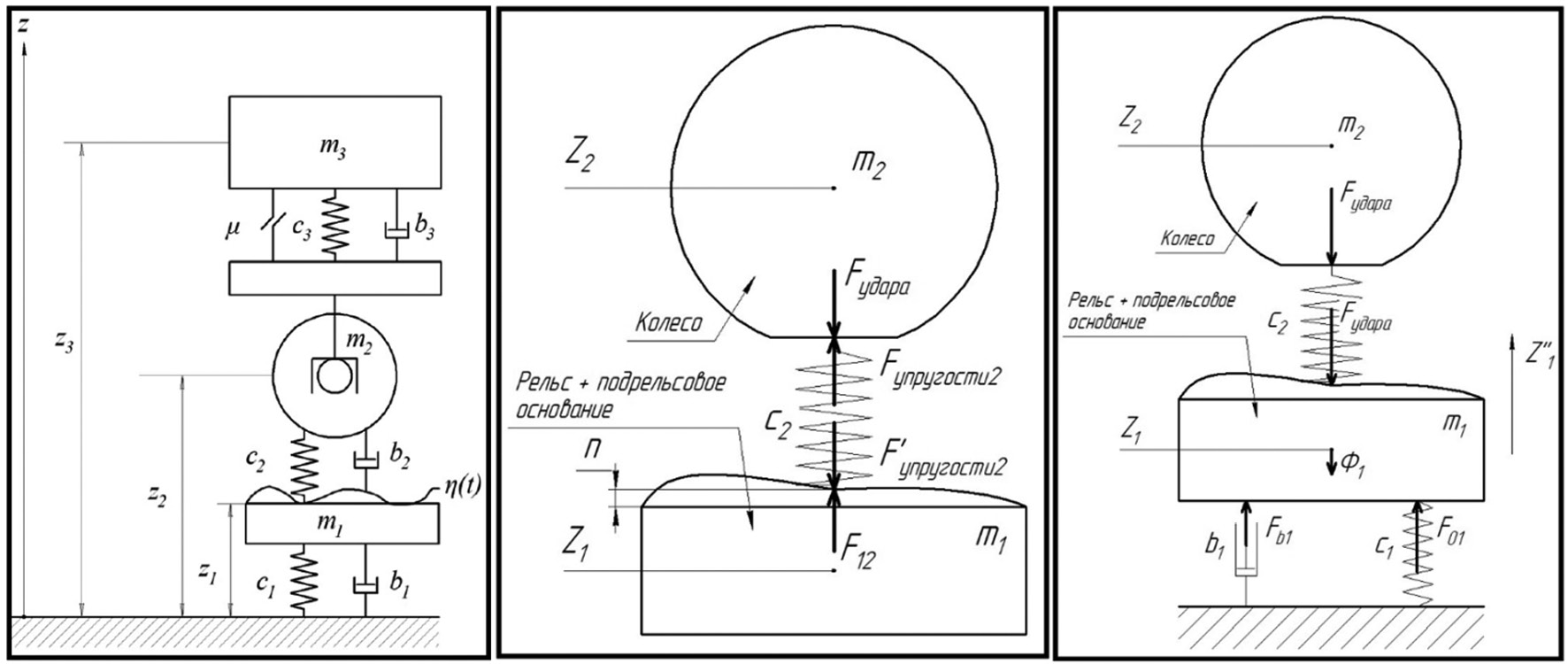 — функция силы трения фрикционного гасителя; μ — коэффициент сухого трения фрикционного гасителя; m1, m2 и m3 — приведенная масса участка пути, масса колеса и подведенная к нему масса неподрессоренных частей тележки и масса обрессорных частей тележки и части кузова, приходящегося на одну тележку соответственно; b1, b2, b3 — коэффициенты вязкого демпфирования пути, демпфирования в зоне контактного взаимодействия колеса с рельсом и демпфирования в зоне контактного взаимодействия колеса с рельсом; c1 — жесткость рельса и подрельсового основания пути; c2 = [Если (z2 – z1 – η) > 0, тогда 0, иначе 109] Н/м — функция жесткости в зоне контактного взаимодействия колеса с рельсом; c3 — жесткость основного рессорного комплекта.