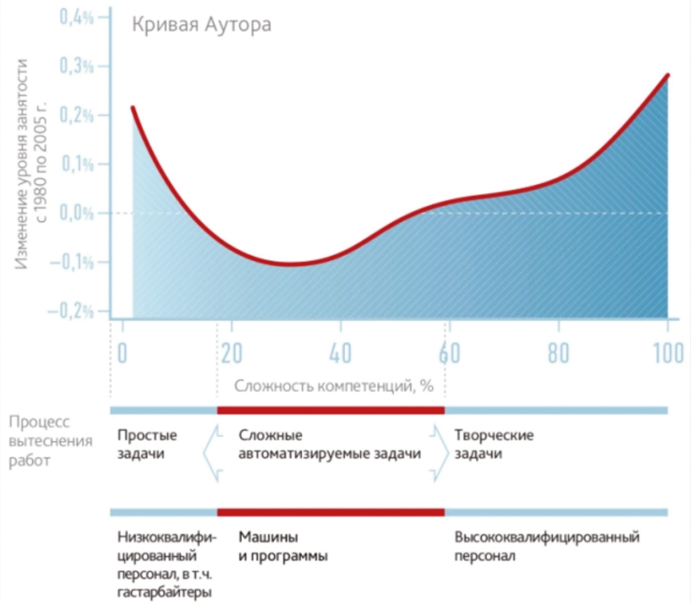1. Анализ на примере кривой Аутора [7] демонстрирует, что текущая ситуация подтверждает тенденцию. Эта тенденция — эффект цифровой трансформации. Так называемые «белые воротнички» под ударом, их первых смоет цифровой революцией. Так как растет занятость среди низко- и высококвалифицированных работников, при этом сокращается занятость среди работников средней квалификации.